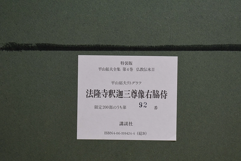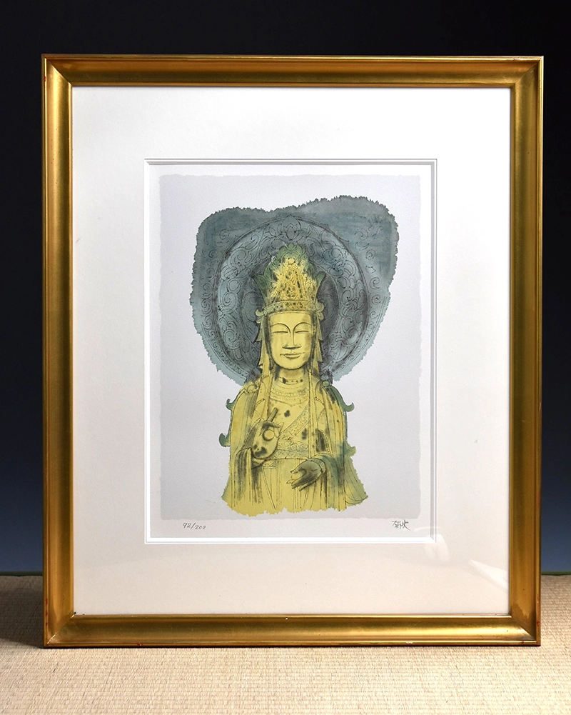 「法隆寺釈迦三尊像右脇侍」という題材は、仏教美術・古寺への関心と親和性が高く、平山郁夫の作品世界とも相性の良いモチーフです。平山郁夫は文化財や古代への眼差し、祈りを感じさせる主題で知られ、寺院や仏像を扱った作品は「落ち着いた空間に飾りやすい」として一定の需要があります。