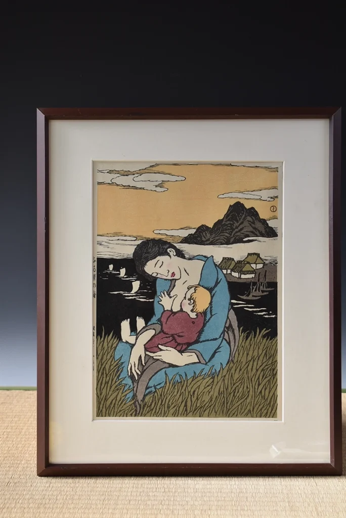 今回は、竹久夢二の「木版画 ふる里の海」を、岐阜市にて店頭買取いたしました。額サイズは幅約36.7cm×高さ約44.5cm。