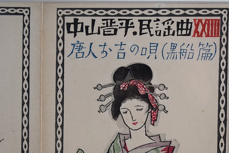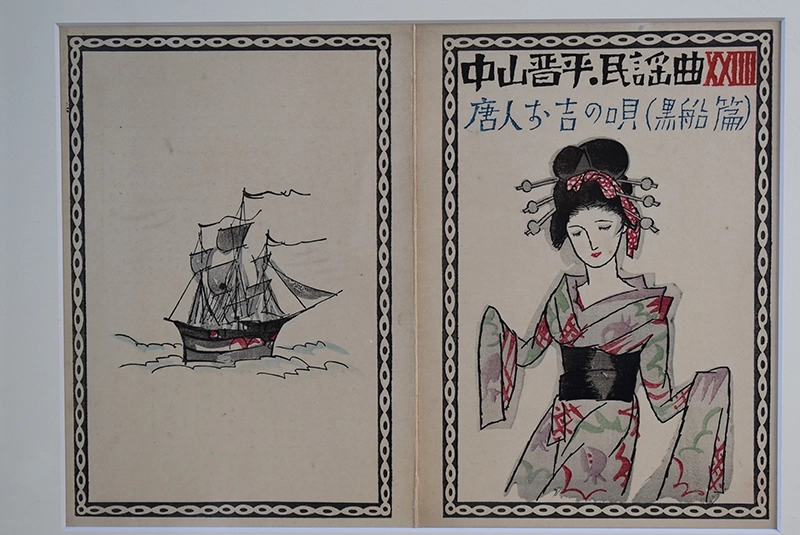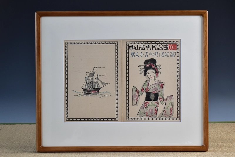 竹久夢二は大正ロマンを象徴する作家として、絵だけでなく詩情や物語性を感じさせる題材が多く、今も幅広い層に人気があります。本作は「唐人お吉の唄(黒船篇)」とあり、歴史的なイメージ(黒船来航)と人物の哀感が重なる題材として知られています。さらに「中山晋平民謡曲」と銘打たれている点から、当時の流行歌・民謡曲と美術表現が結びつく“時代文化の一枚”としての面白さもあります。