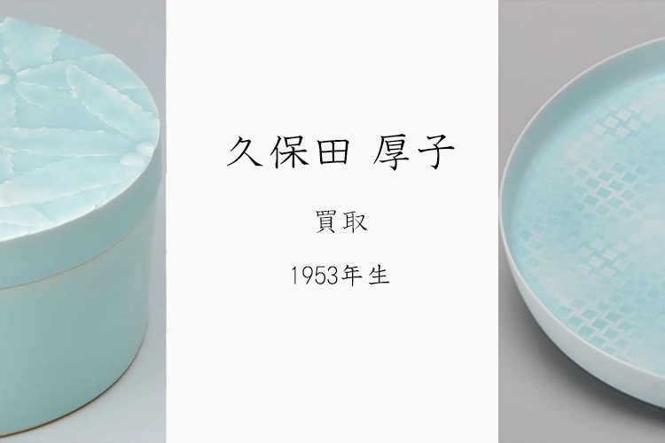 久保田厚子は東京藝術大学で陶芸を学び、長年にわたり独自の磁器表現を追求してきた作家です。代表作《青白磁フリージア文壺》は、わずかな磁土からロクロを始め、土の量や高さを調整しながら一年がかりで形にした大作。ロクロ挽きで高さ60cm以上を立ち上げるには工夫が必要で、内部から引き上げるように成形を繰り返し、独特のフォルムを完成させました。 制作はいつも突然の閃きから始まり、技法とイメージが相互に刺激し合うスタイルが特徴です。植物文様から幾何学模様へと大胆に変化したり、まったく異なるスタイルの作品を同時に作り上げたりと、常に新しい表現へ向かって進み続けています。展示で過去の作品を見て“美しくて驚く”というほど、彼女の表現は日々進化を続けています。