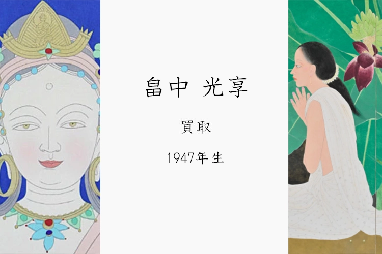 畠中光享は1947年奈良県生まれの日本画家。古典と自然を源としながら、現代における日本画の可能性を追求してきました。 京都市立芸術大学で学び、1977年にシェル美術賞展一等賞、翌年には東京セントラル美術館日本画大賞展で大賞を受賞。以降、京都を拠点に創作を続け、「横の会」「Artist Group -風-」などの活動でも注目を集めます。 近年では、興福寺中金堂の法相祖師画を手がけ、宗教的精神性と気品を備えた作品を発表。 「歴史と自然から学ぶしかない」という信念を胸に、写真や映像に頼らず自らの筆で描く姿勢を貫いています。小松均の言葉「絵描きは70歳を過ぎてから」を糧に、今もなお精進を続ける畠中の絵は、清らかで格調高い気韻を放っています。